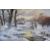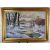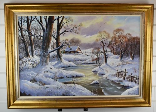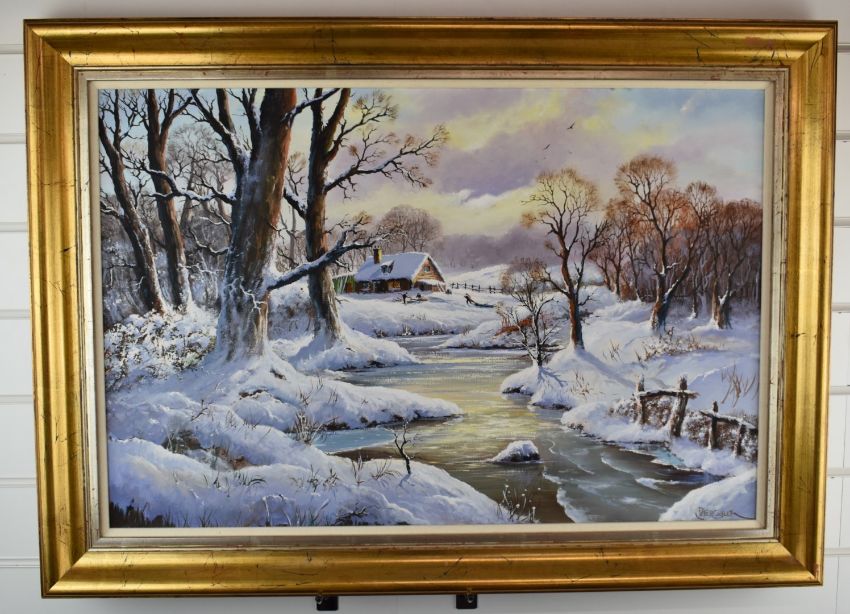 Peter Cosslett (born 1927) oil on canvas thatched cottage beyond a lake in the snow, with figures collecting firewood by the cottage, signed lower right, 50 x 75cm, in gilt frame