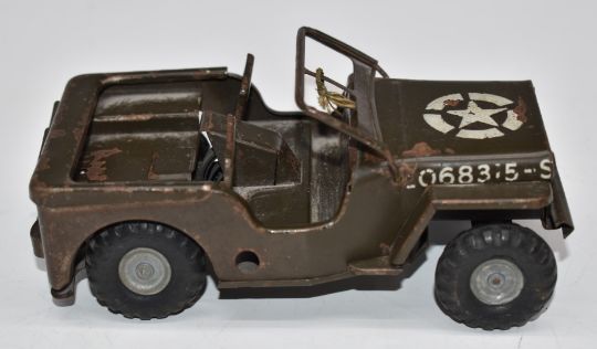 Three tinplate toys comprising an Arnold or similar clockwork open topped sports car marked 'German US Zone', a Tri-ang clockwork military Jeep and a similar spring loaded field gun, largest 25 cm long.