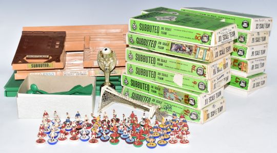 A collection of Subbuteo table football team and accessories, most in original boxes, together with some empty boxes.