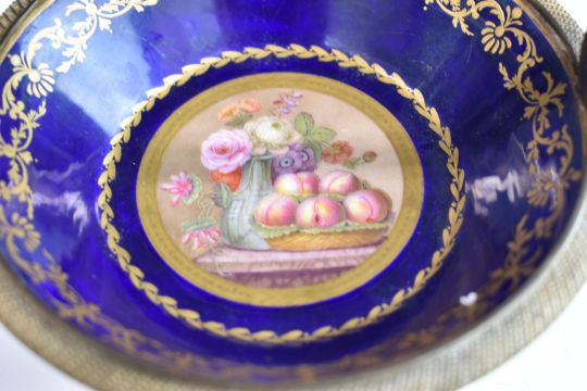 Sèvres porcelain dish with hand painted decoration of fruit and flowers, in ormolu mount and associated stand, diameter 15cm, maximum H11cm