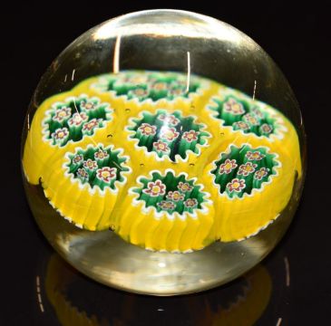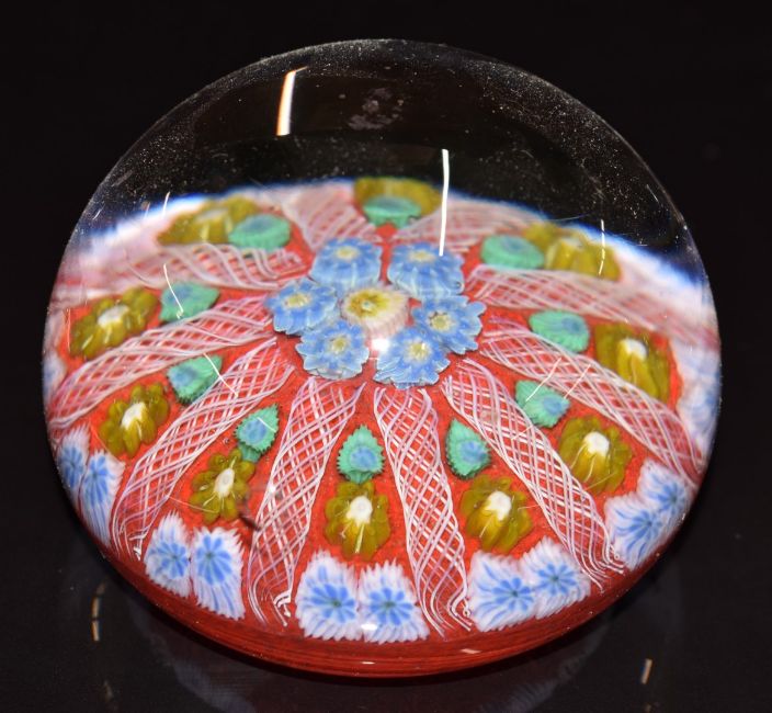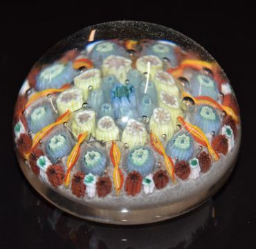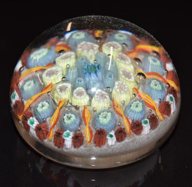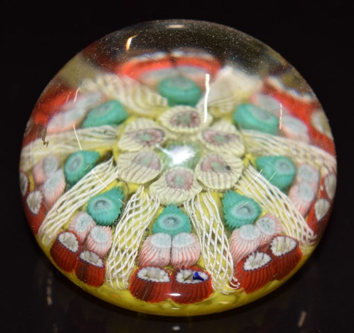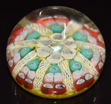 Eight glass paperweights mostly with millefiori decoration, some with latticino canes, including Scottish examples, largest 80mm in diameter.