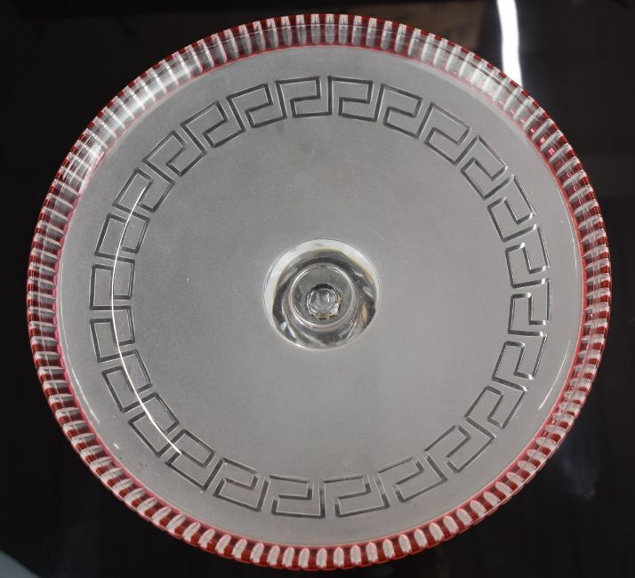Frosted and cranberry flash overlaid glass tazza with Greek key decoration and star cut base, 28cm in diameter.