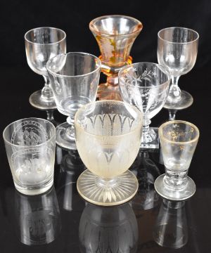 Eight 18thC and later drinking glasses including etched and gilded examples, rummers, flash overlaid and cut example etc, largest 16cm tall.