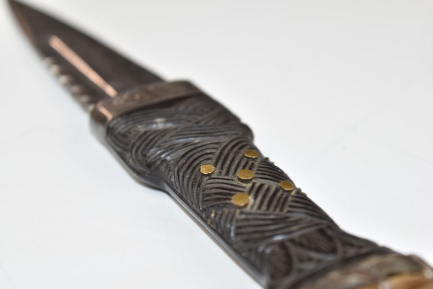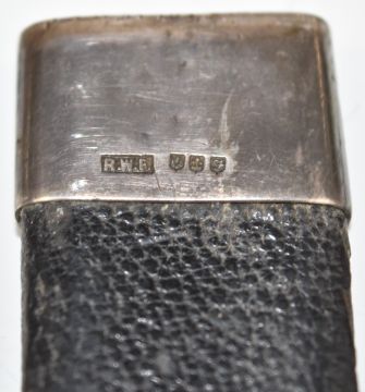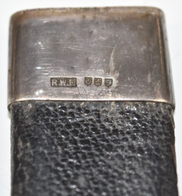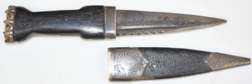 R W Forsyth of Glasgow and Edinburgh Scottish Sgian Dubh dagger with hallmarked silver mounts, carved ebony handle, stone set pommel and named and engraved 9cm blade, in matching silver mounted leather scabbard, overall length 19cm. PLEASE NOTE ALL BLADED ITEMS ARE SUBJECT TO OVER 18 CHECK ON COLLECTION OR DELIVERY