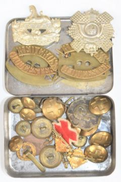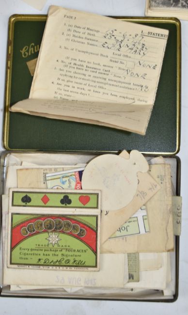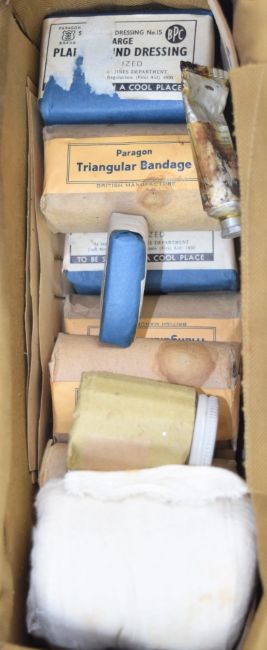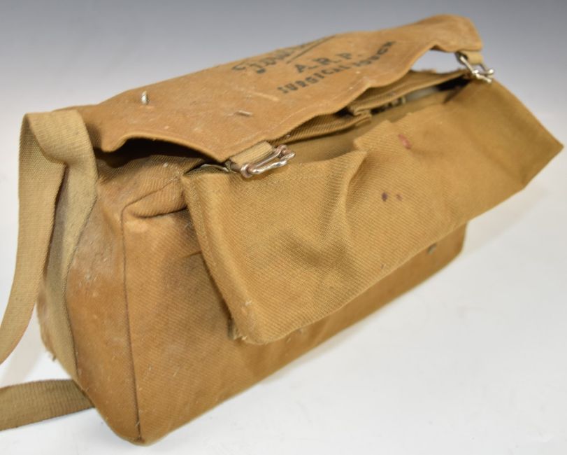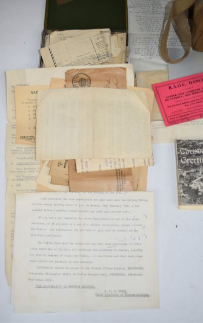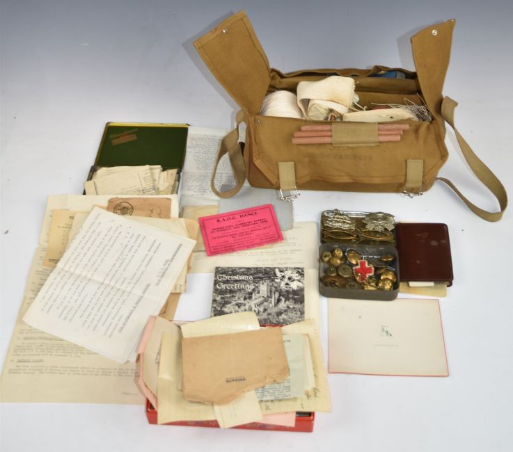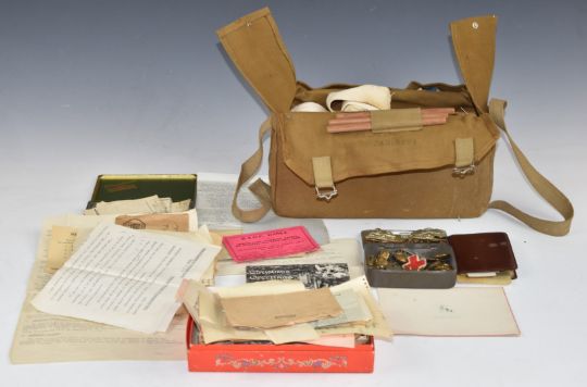 WW2 ARP 'Paragon' surgical pouch with contents, together with associated paperwork, ration books, Red Cross buttons and shoulder badges, Gloucestershire Regiment and Highland Light Infantry badges, paperwork for Private Creswell (Gloucester) RAOC and Tuffley Platoon Home Guard etc