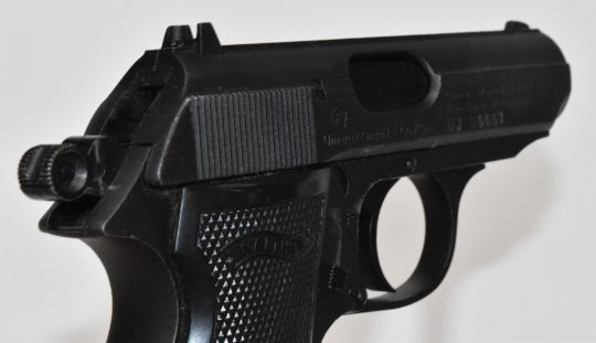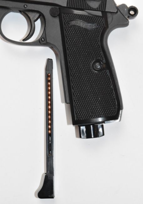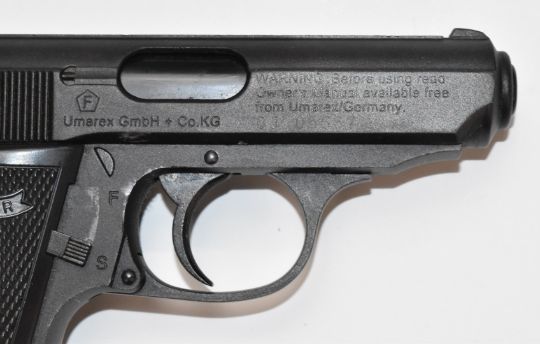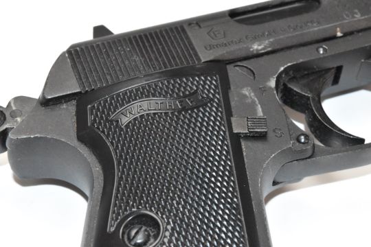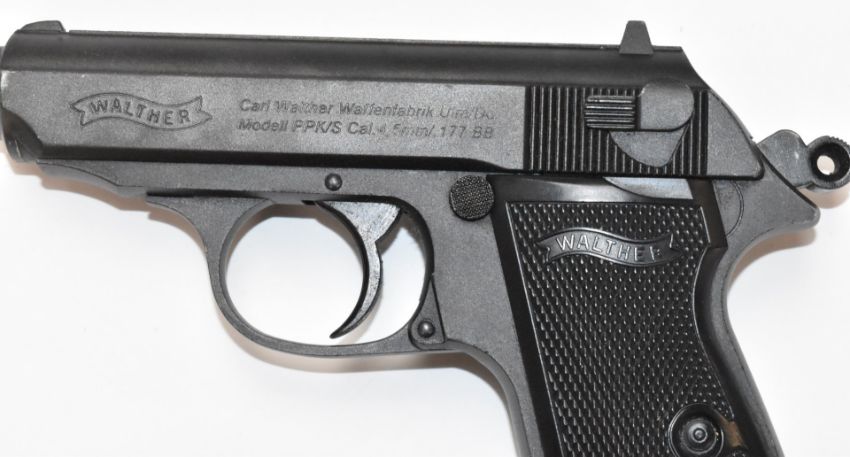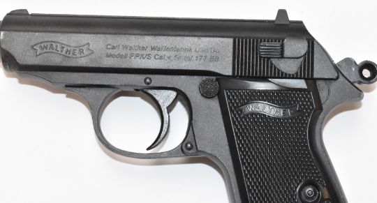 Walther PPK/S .177 CO2 air pistol with named and chequered composite grips, serial number 05667, in original box with instructions.