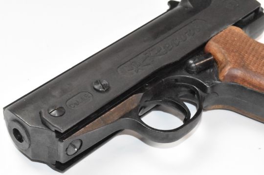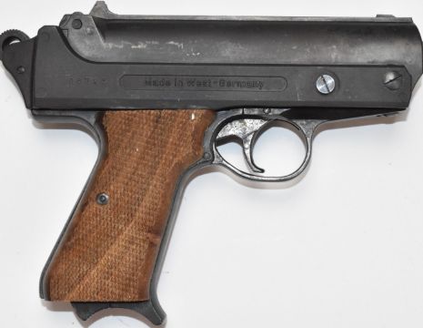 FB Record Jumbo .177 air pistol with chequered wooden grips, serial number 08725, in original box with cleaning rod.
