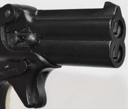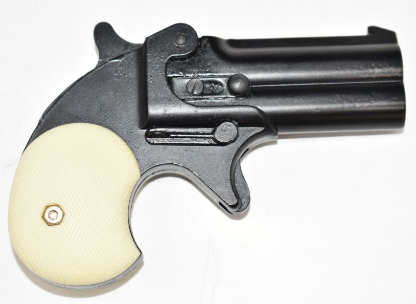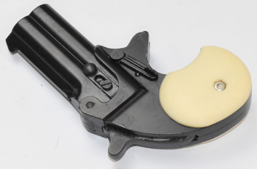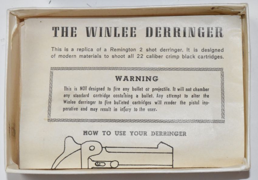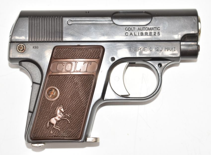 Two pistols comprising the Winlee Derringer .22 starting pistol with chequered faux ivory grips in original box with instruction and Colt 25 style airsoft pistol serial number 199809.