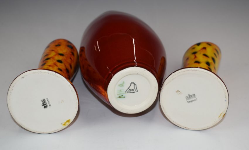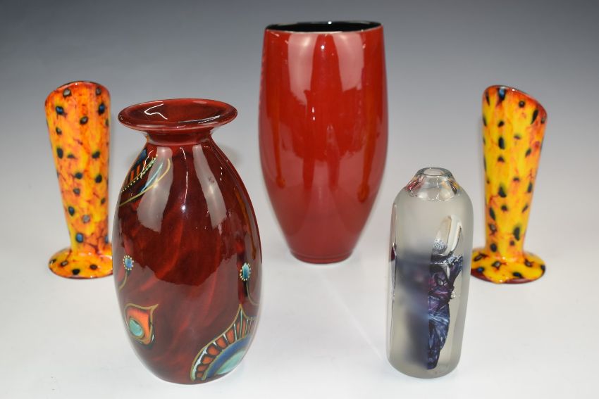 Four Anita Harris pottery vases including a pair, and a Jane Charles signed studio glass vase, tallest 18cm