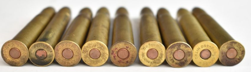 Nine deactivated .500-450 brass cased big game rifle cartridges.