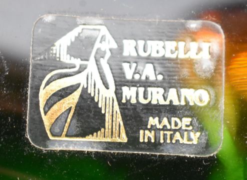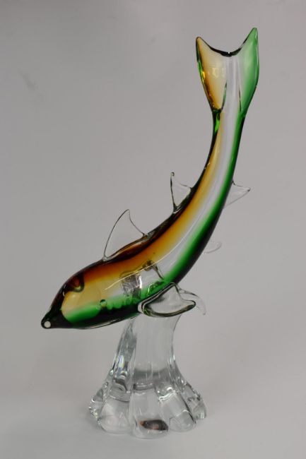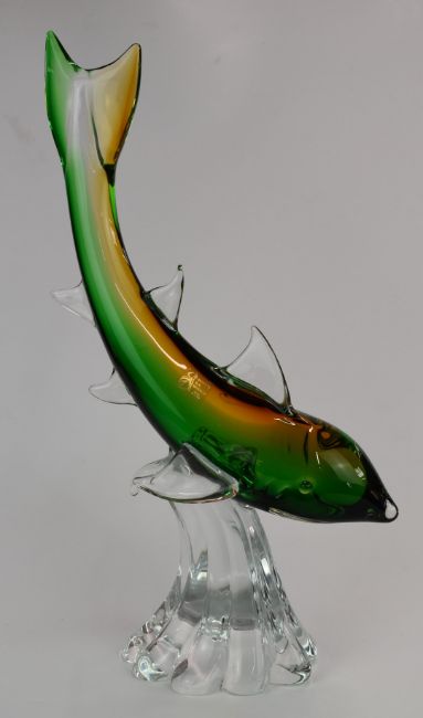 Rubelli Murano Italian glass sculpture depicting a dolphin riding a wave, with original label, 47.5cm tall.