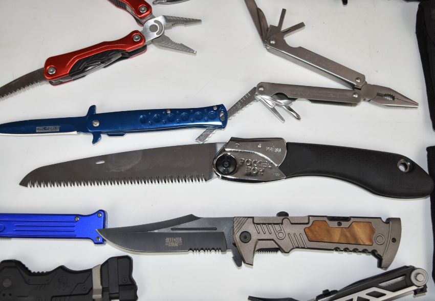Collection of pocket knives and multitools including Silky Pocket Boy, Gerber, Smith & Wesson, 1st Responder & Defender Extreme etc, longest blade 12cm. PLEASE NOTE ALL BLADED ITEMS ARE SUBJECT TO OVER 18 CHECK ON COLLECTION OR DELIVERY