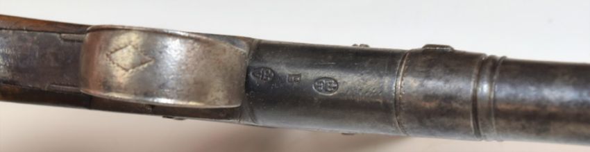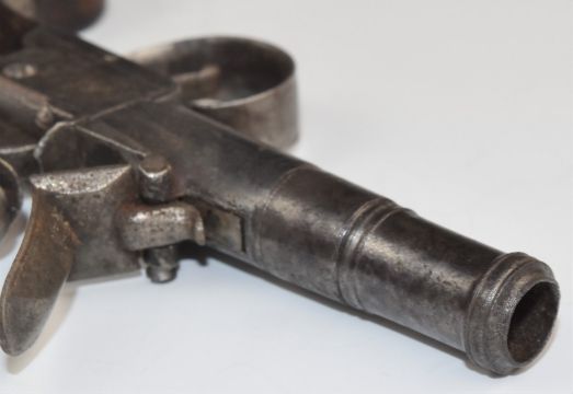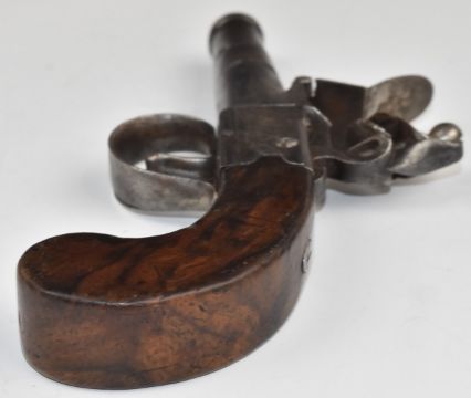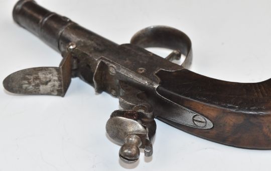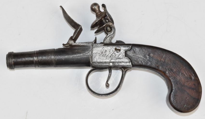 Indistinctly named flintlock pocket pistol with shaped wooden grips and 1.5 inch smooth bored turn off cannon barrel, overall length 15.5cm.