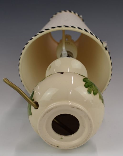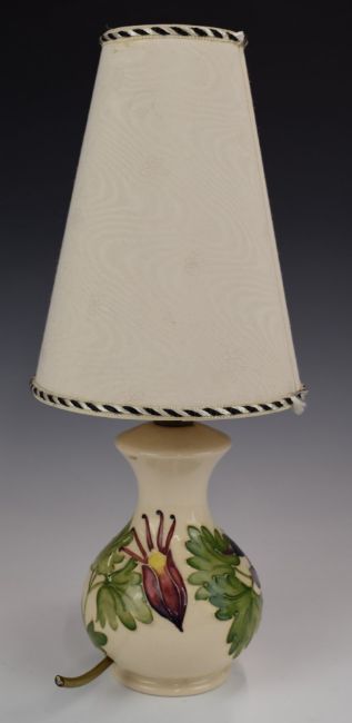 Moorcroft lamp decorated with aquilegia flowers, H17cm, with shade 43cm