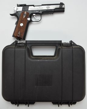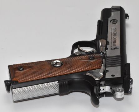 Colt Special Combat .177 air pistol with faux wooden grips, serial number 13H39737, in hard carry case.