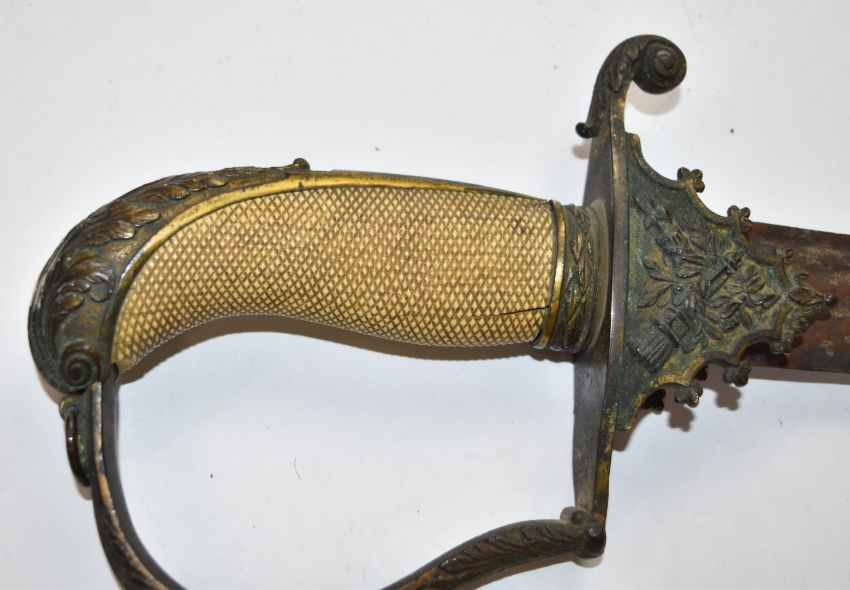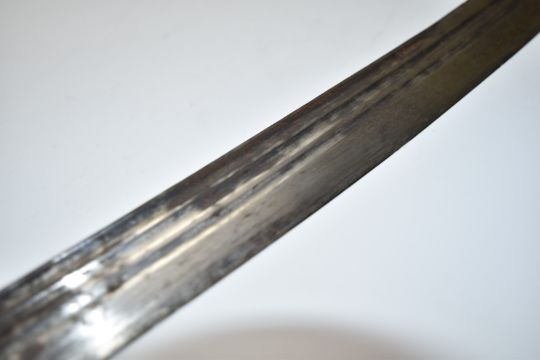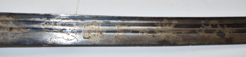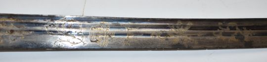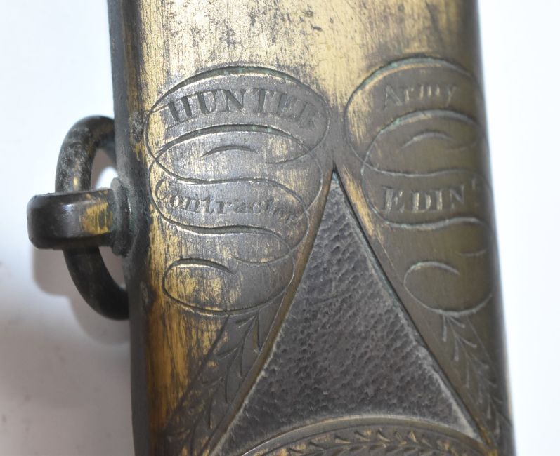 Napoleonic era British Yeomanry officer's sword with ivory handle, part decorated 81cm fullered curved blade retaining some bluing and ornately decorated scabbard engraved Hunter Army Contractor Edinburgh. The item is sold with a current exemption certificate for the sale of ivory. PLEASE NOTE ALL BLADED ITEMS ARE SUBJECT TO OVER 18 CHECK ON COLLECTION OR DELIVERY