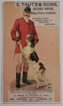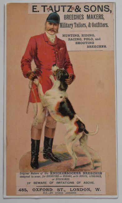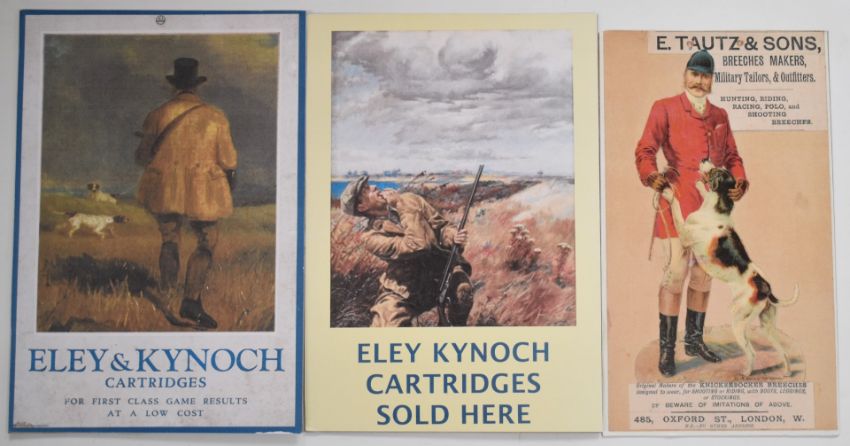 Three modern E Tautz & Sons 'Breeches Makers, Military Tailors & Outfitters. Hunting, Riding, Racing, Polo, and Shooting Breeches.', 'Eley Kynoch Cartridges Sold Here' and 'Eley & Kynoch Cartridges for first class game results at a low cost' shotgun cartridge shop display or advertising boards, largest 41.5 x 29cm.