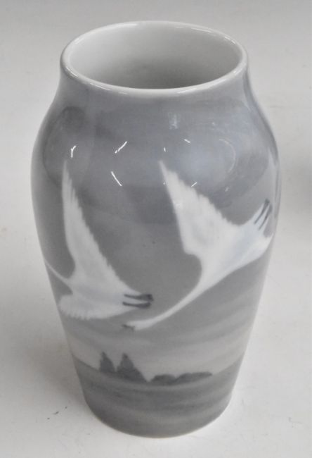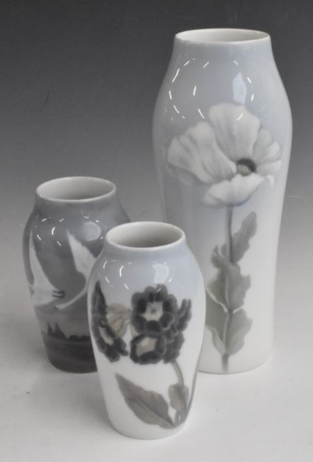 Three Royal Copenhagen vases comprising no 100/232 with white poppy and bud on reverse, no 1955/88A with flying swans and no 206/88A with purple flower, all pre-1923, tallest 23cm