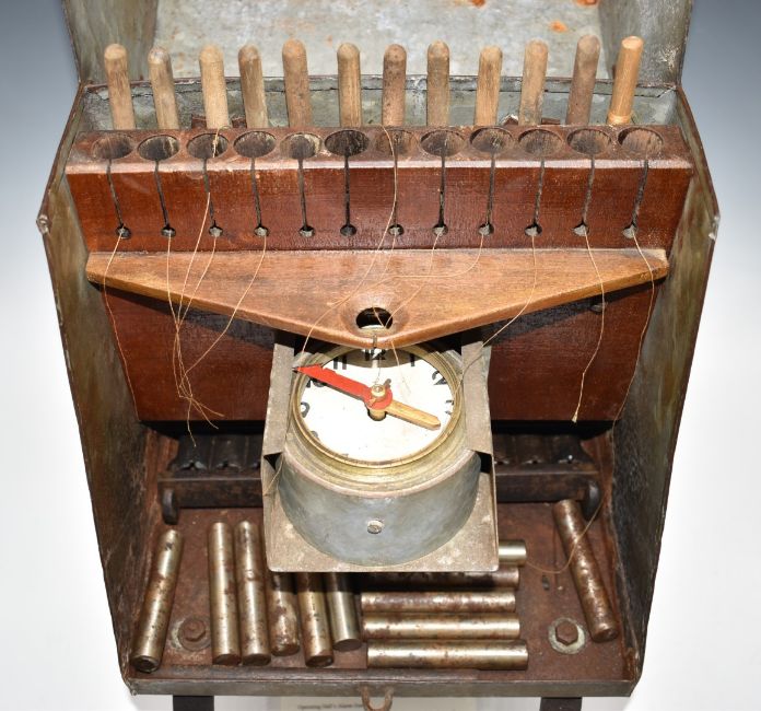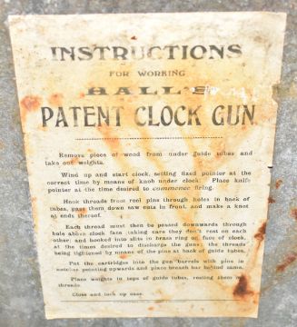 J Hall of Cumberland 12 bore pinfire bird scaring clock alarm gun 'The Cumberland Cannon' marked to the galvanized case J Hall's Patent Clock Gun, Station Road Works, Wigton, Cumberland' with original instructions label to the inside of the lid, wooden interior and brass padlock, raised on shaped iron legs, 58 x 30 x 47cm.