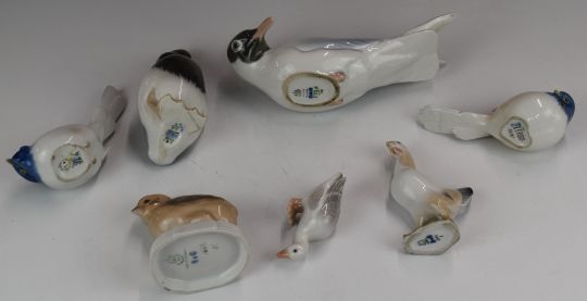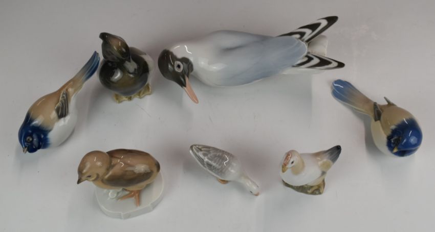Seven Copenhagen and Bing & Grondhal bird ornaments comprising Seagull, Tufted Duck, Duck on base, Goose head down, Hen, Bluebird and Bluebird tail up, tallest 12cm