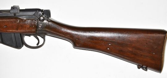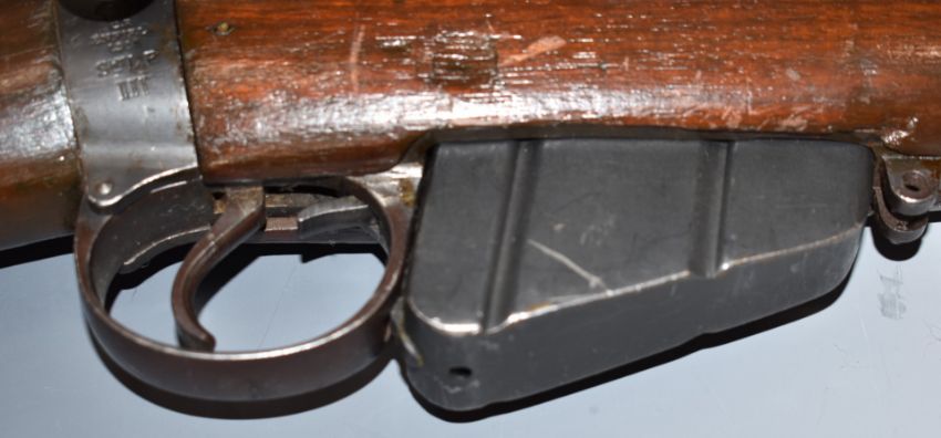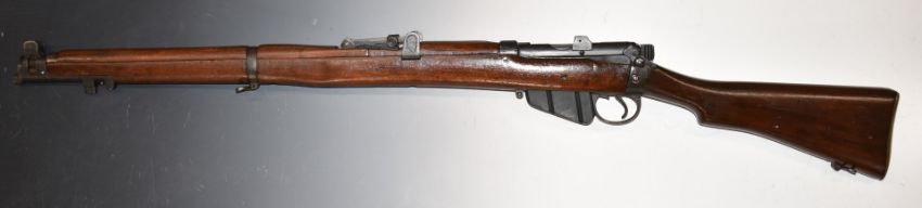Short Magazine Lee-Enfield (SMLE) .303 bolt-action rifle with adjustable sights, sling mounts, brass butt plate with storage compartment, multi-shot magazine and 26 inch barrel, overall length 113cm, serial number 3835. PLEASE NOTE THAT A VALID RELEVANT FIREARMS/SHOTGUN CERTIFICATE IS REQUIRED TO HANDLE/PURCHASE THIS ITEM.