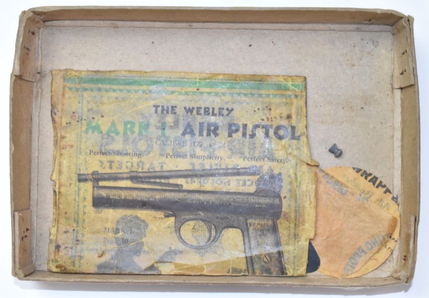 Webley Premier .22 air pistol with named and chequered Bakelite grips, serial number 1776, in original box with spare spring and accessories.