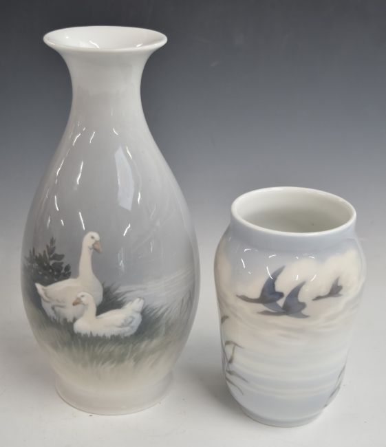 Two Royal Copenhagen vases no 2466/2585 with geese family and no 1440/108 geese in flight, tallest 29cm