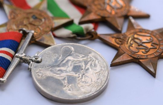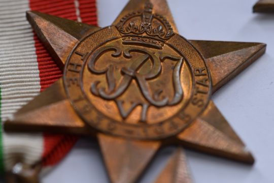 WW2 medals comprising 1939/1945 Star, Africa Star, Italy Star, Burma Star, Atlantic Star and War Medal with postal box addressed to Mr D S Dilling, Filton, Bristol and return address Director of Royal Navy Accounts Bath, together with a Japanese 'war trophy' captured flag