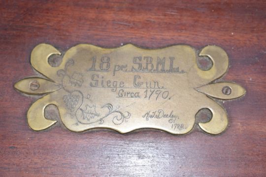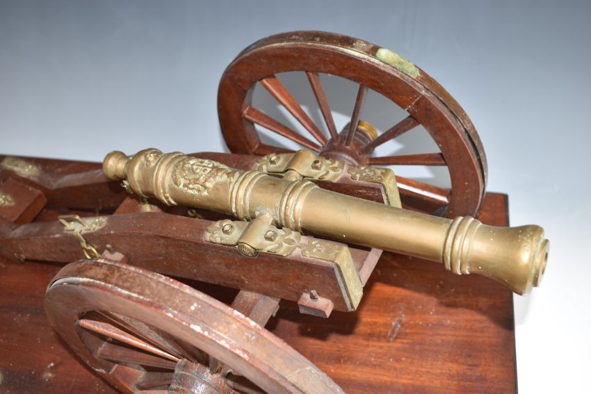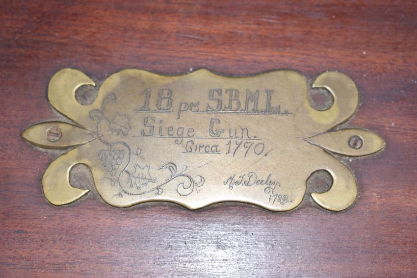 Model circa 1790 18 pounder siege cannon with bronze or similar barrel and wooden carriage, on base with plaque giving details and date of build as 1982, overall length 64.5cm