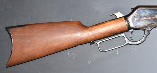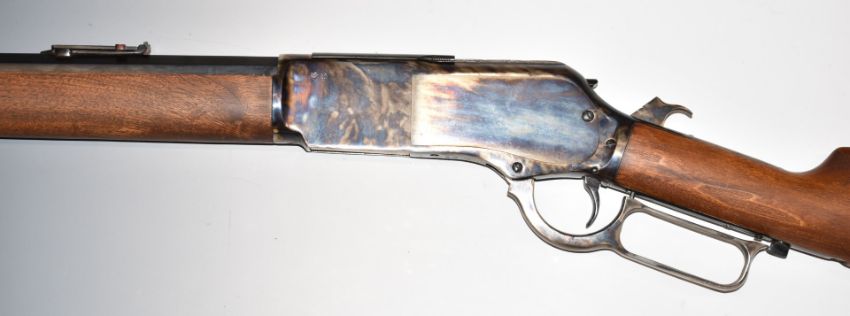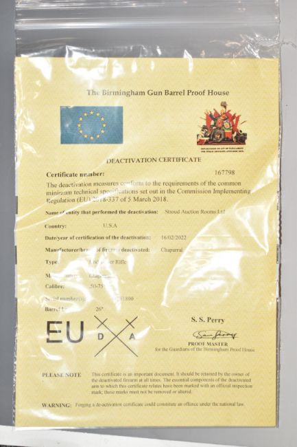Deactivated Chapparal Repeating Arms Model 1876 .50-95 under-lever action repeating rifle with adjustable pop-up ladder sights, storage compartment to the butt and 26 inch octagonal barrel marked 'Chaparral-Repeating Arms King's-Improved-Patented-March 29.1866. October 16.1860', overall length 119cm, serial number W761800, with deactivation certificate dated 16/02/22