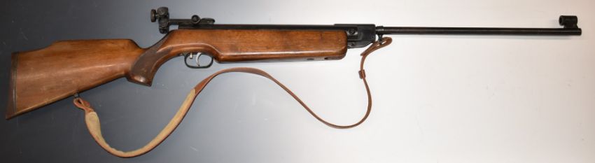 Weihrauch HW35 .22 air rifle with semi-pistol grip, raised cheek piece, adjustable trigger, leather sling and adjustable peep-hole target sights, serial number 710703.