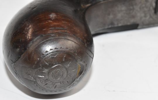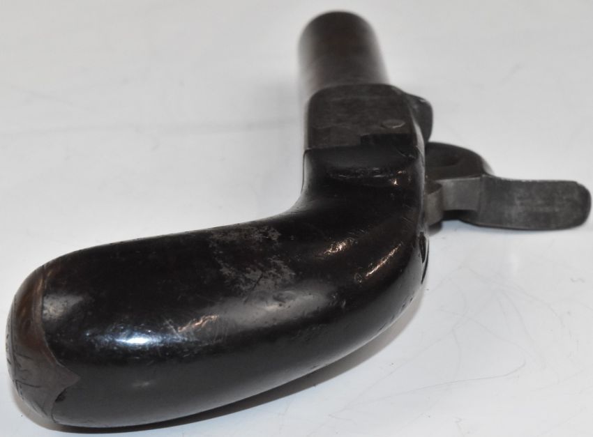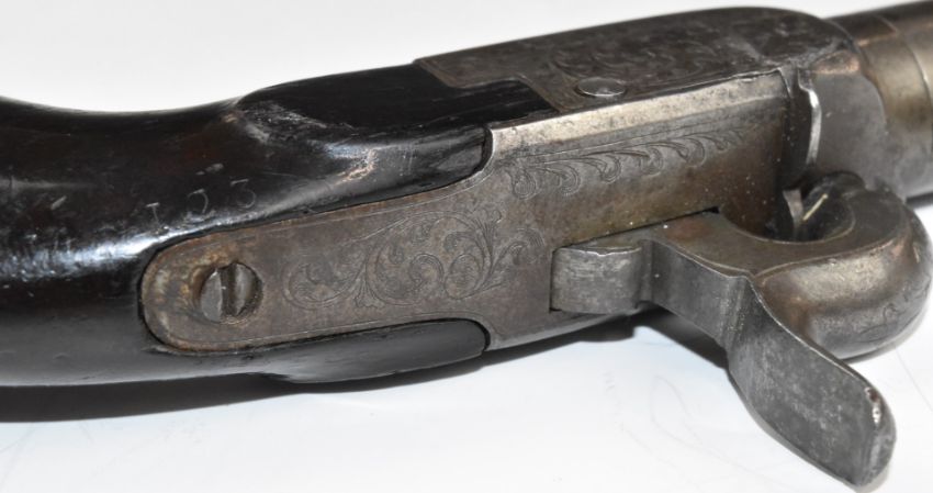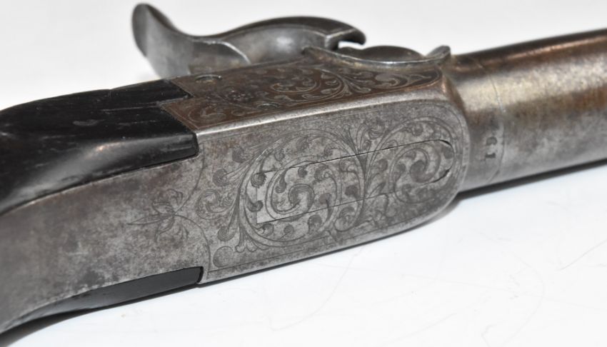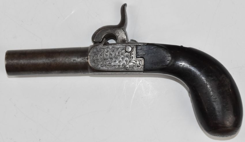 Belgian percussion hammer action pocket pistol with engraved lock, underside, top plate, hammer and folding trigger, storage compartment to the butt cap and 2 inch rifled barrel, overall length 16.5cm.