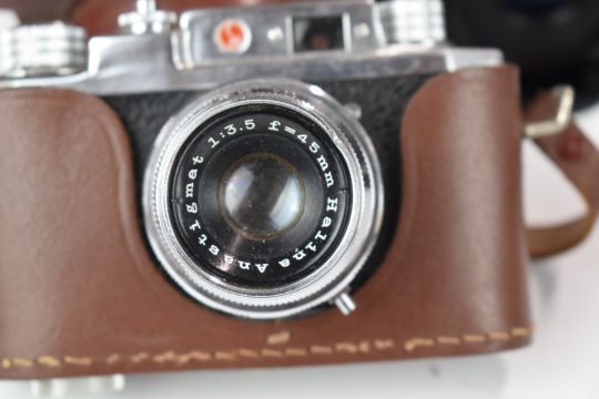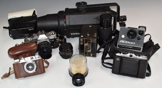 Cameras and accessories to include Canon AL-1 SLR fitted with Tamron 1:2.5 28mm lens, Canon 50mm 1:1.8 lens, Sigma 1:4.5 f=70-210mm lens, Bowens Gemini GM250R studio moonlight with cables and umbrella, Polaroid button, Zeiss Ikon 517/16, EL-Nikkor 50mm 1:2.8 enlarger lens, filters etc
