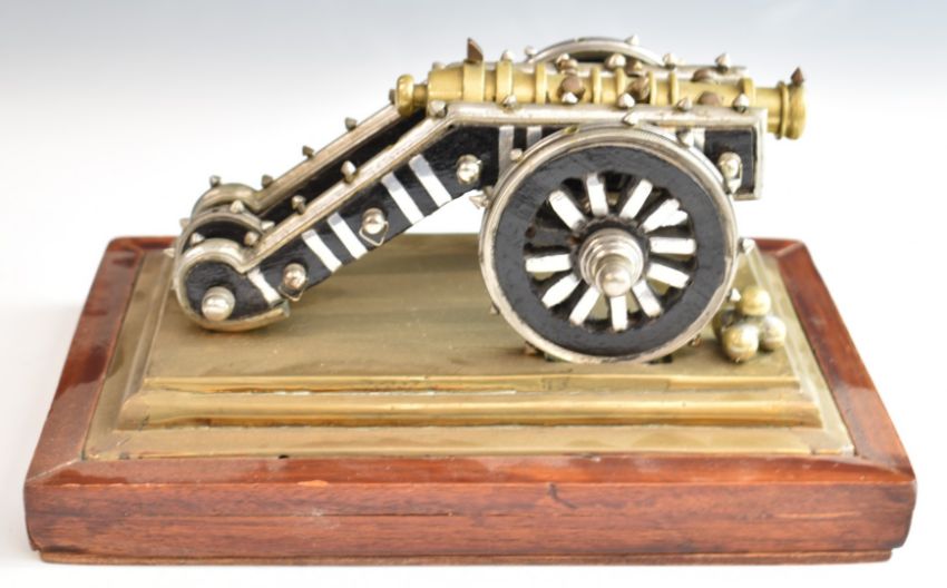 Three model cannon comprising two with studded decoration and wheels and one with circular brass base with chain surround, length of longest barrel 13cm, diameter of circular base 23cm