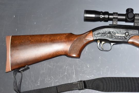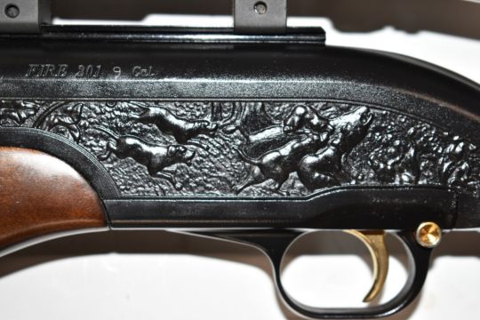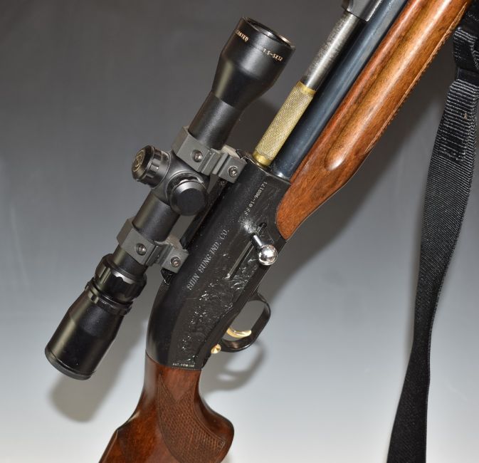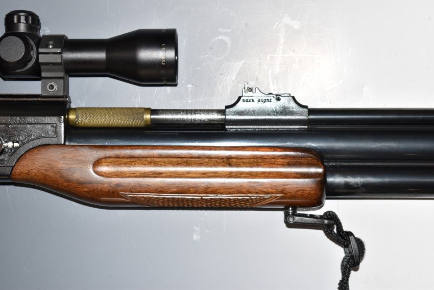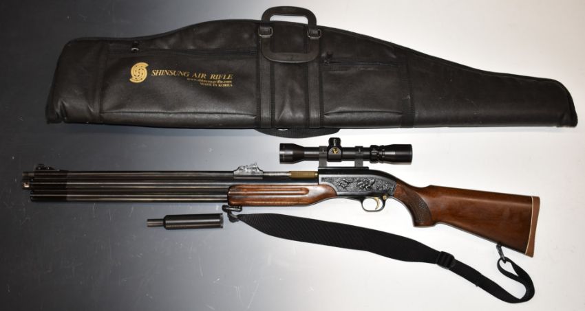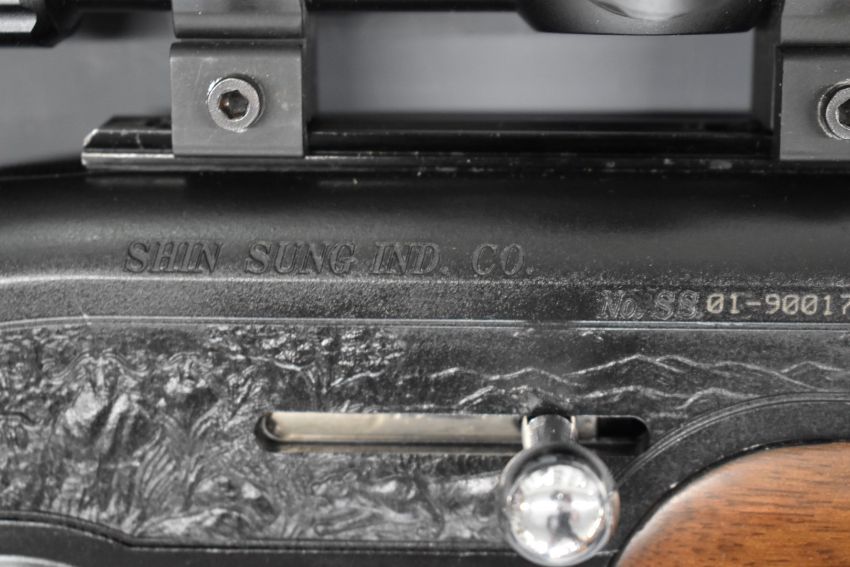 Shin Sung Ind Co 9mm PCP FAC air rifle with hunting scenes to the action, chequered semi-pistol grip, sling, adjustable sights and Simmons 1.5-5x32 8-point fully coated scope, serial number 01-90017 with ammunition and re-filling bottle.  PLEASE NOTE THAT A VALID RELEVANT FIREARMS/SHOTGUN CERTIFICATE IS REQUIRED TO HANDLE/PURCHASE THIS ITEM.