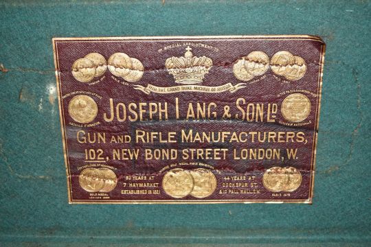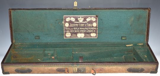Leather and canvas bound shotgun carry case with 'Joseph Lang & Son Ld Gun & Rifle Manufacturers, 102, New Bond Street London, W. By Special Appointment To H.I.H. The Grand Duke Michael Of Russia' label and fitted interior, 83 x 22.5 x 8cm.