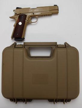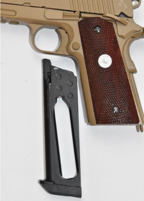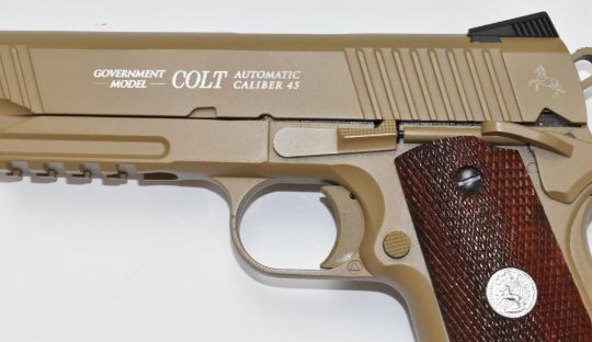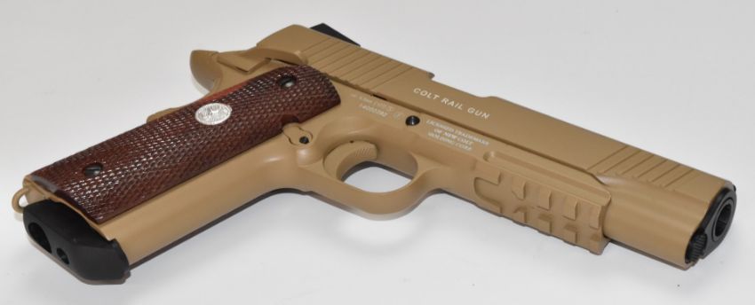 Colt Government .45 automatic Rail Gun style .177 airsoft pistol with faux wooden grips, serial number 14G02282, in hard carry case.