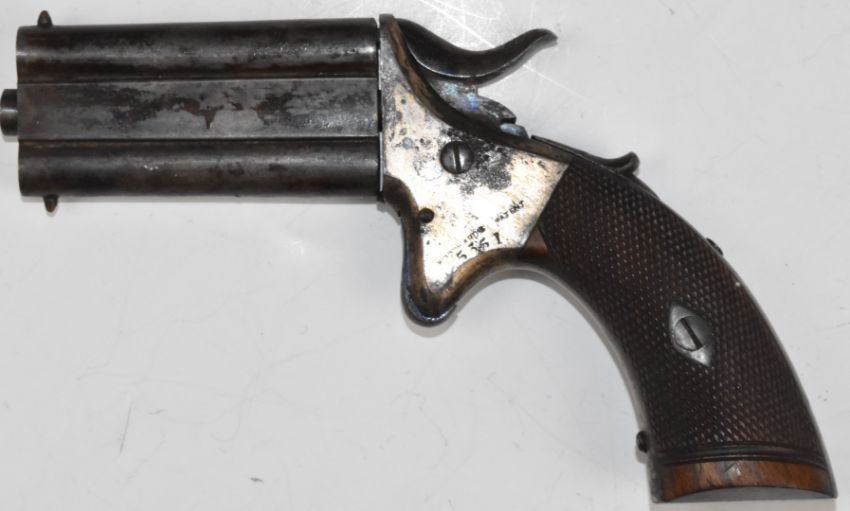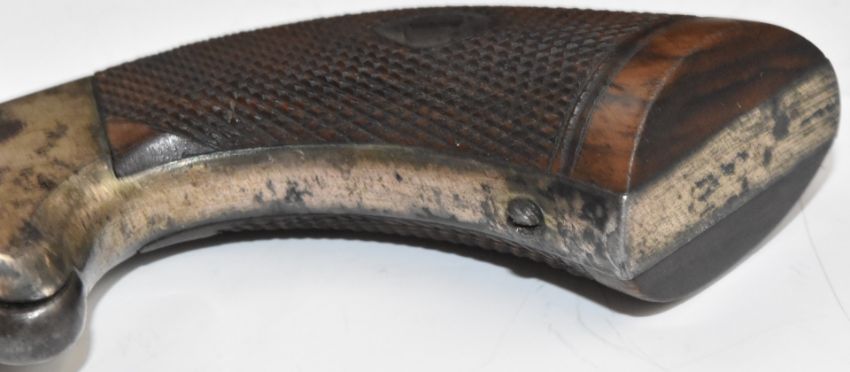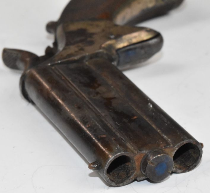 Woodward's patent hammer action double barrelled over and under pocket pistol with chequered grips, thumb slide safety, sheath trigger and 2.25 inch hand rotated smooth bored barrels, overall length 15cm.