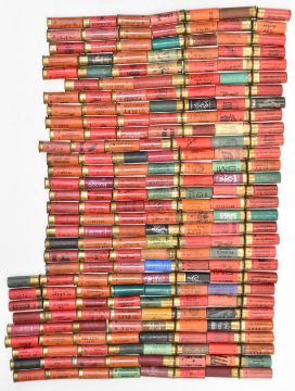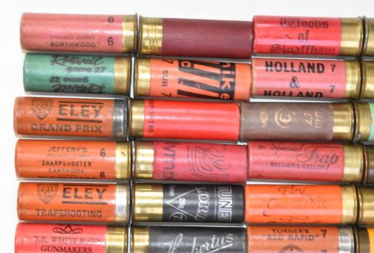 Two-hundred inert 12 bore paper cased collector shotgun cartridges including Ebrall Brothers, Richardson of Halesworth Style, B E Chaplin of Winchester, Westley Richards, New Zealand Championships, Hammant's of Henley-on-Thames, Hammond Brothers, Holland & Holland, John Wilkes Doughty, Woods of Swaffham, Forrest & Sons The Tweed, Churchill Gem, Woburn Rabbit Clearance Society Bedfordshire, Carey Gunmakers The Ledbury, John Rigby & Co The Sackville, Gray & Co Inverness Autokill etc. From the collection of Ken Rutterford.