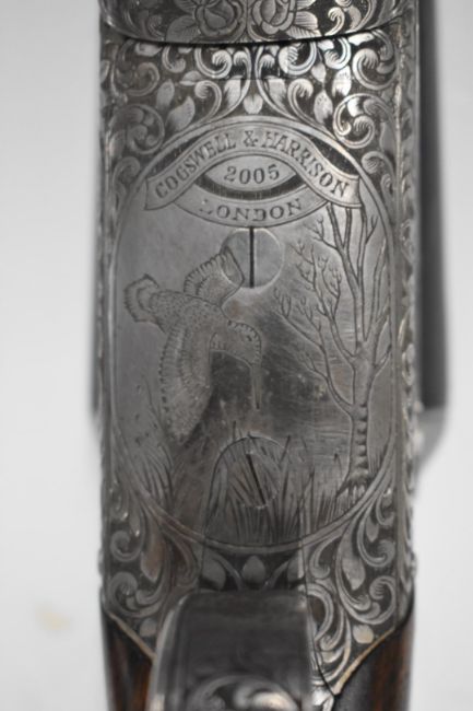 Cogswell & Harrison Victoria 16 bore side by side ejector shotgun with engraved scene of a woodcock in flight to the underside, all over fine floral and scrolling engraving, gold inlaid monogram to the thumb lever, chequered grip and forend, vacant gold cartouche to the underside of the stock, double trigger and 27 inch barrels, overall length 11.5cm, length of pull 38cm, serial number 72510.  PLEASE NOTE THAT A VALID RELEVANT FIREARMS/SHOTGUN CERTIFICATE IS REQUIRED TO HANDLE/PURCHASE THIS ITEM.