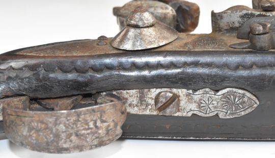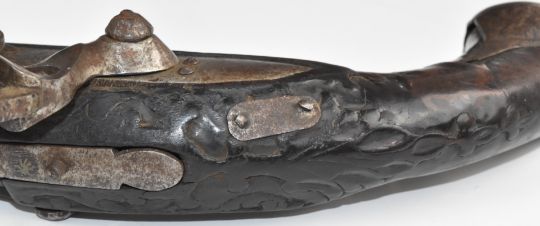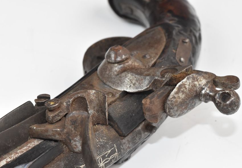 Eastern flintlock pistol with engraved lock, trigger guard and butt plate, carved grip and 10.5 inch silver inlaid smooth bored Damascus barrel, overall length 44cm.