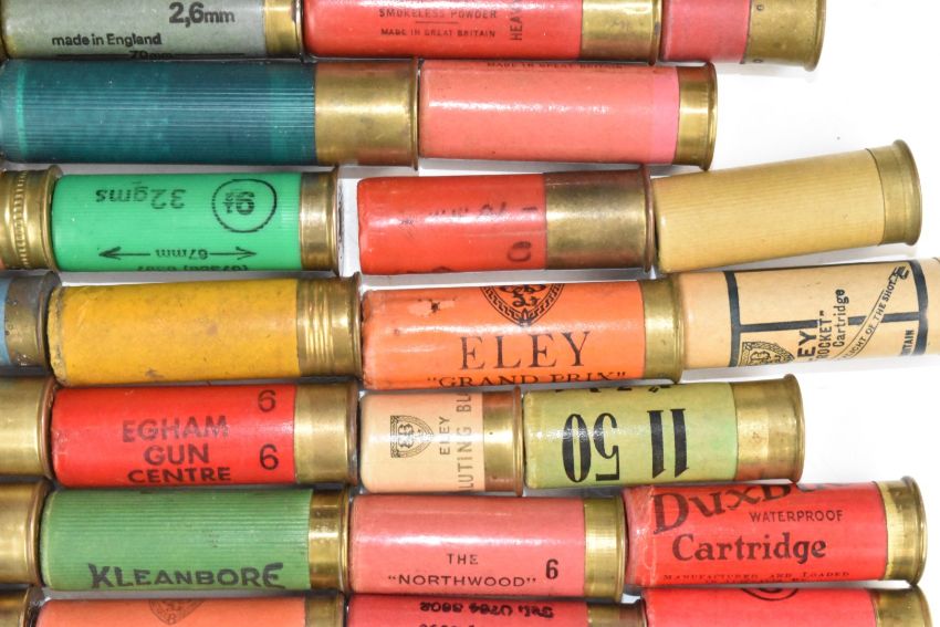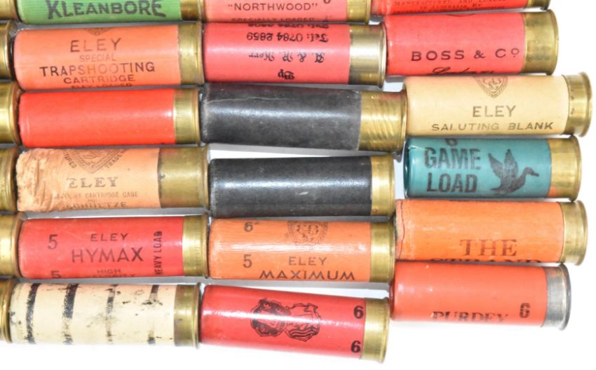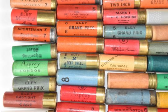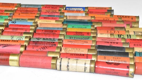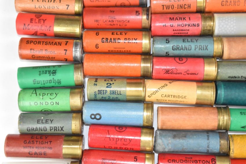 Ninety mainly paper cased collectors shotgun cartridges including Ian Coley of Cheltenham, Asprey of London, A B Harvey & Son Ltd The Strand, Duxbac, Purdey, Boss & Co, A&R Kerr, J Venables & Son of Oxford, Holland & Holland, Eley saluting blank, M Crudgington of Bath, H G Hopkins of Sandbach etc. From the collection of Ken Rutterford.  PLEASE NOTE THAT A VALID RELEVANT FIREARMS/SHOTGUN CERTIFICATE IS REQUIRED TO HANDLE/PURCHASE THIS ITEM. We are not able to post this lot.