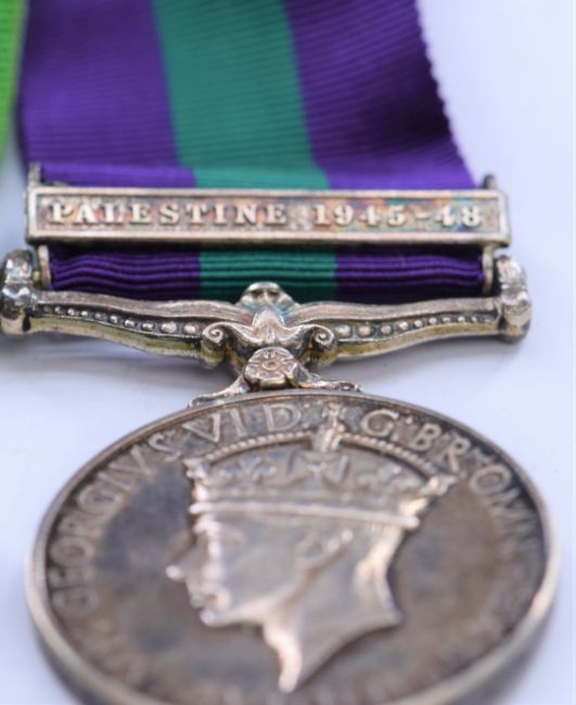 General Service Medal with clasp for Palestine 1945-48 named to 3376 Constable W D Emmanuel, Palestinian Police, together with his WW2 War and Defence medals, postal boxes and associated paperwork