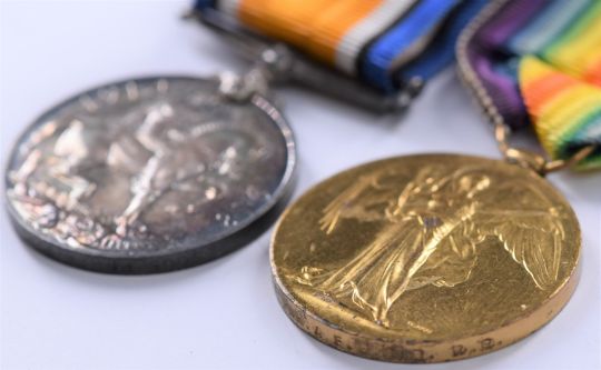 British Army WW1 medal pair comprising War Medal and Victory Medal, both named to 225005 Pioneer A F P ELD, Royal Engineers, in bespoke glazed case