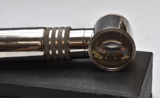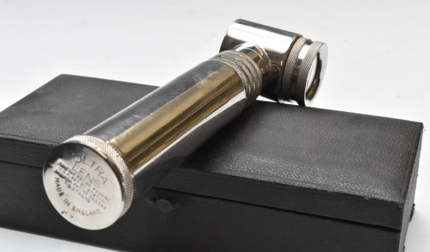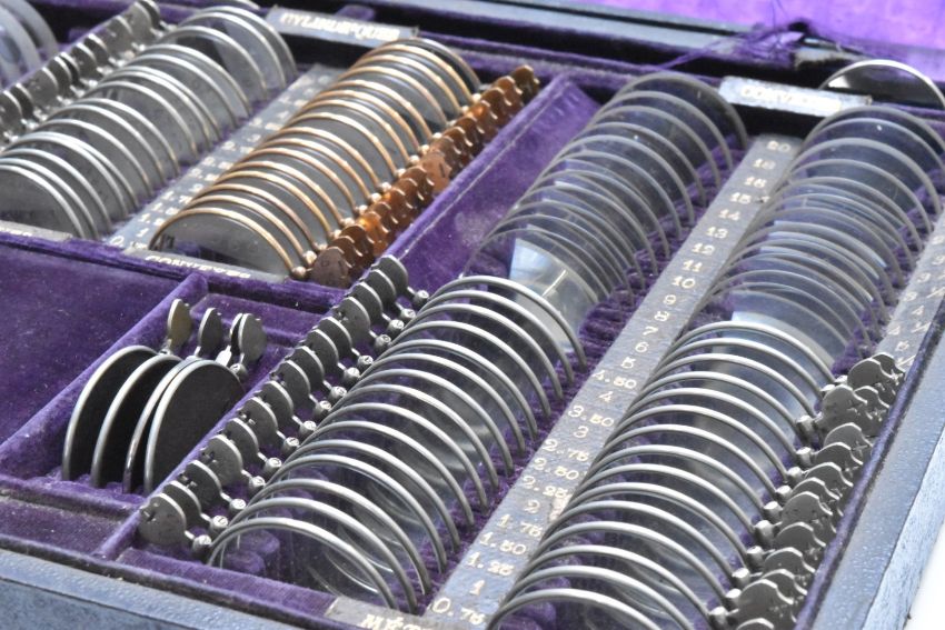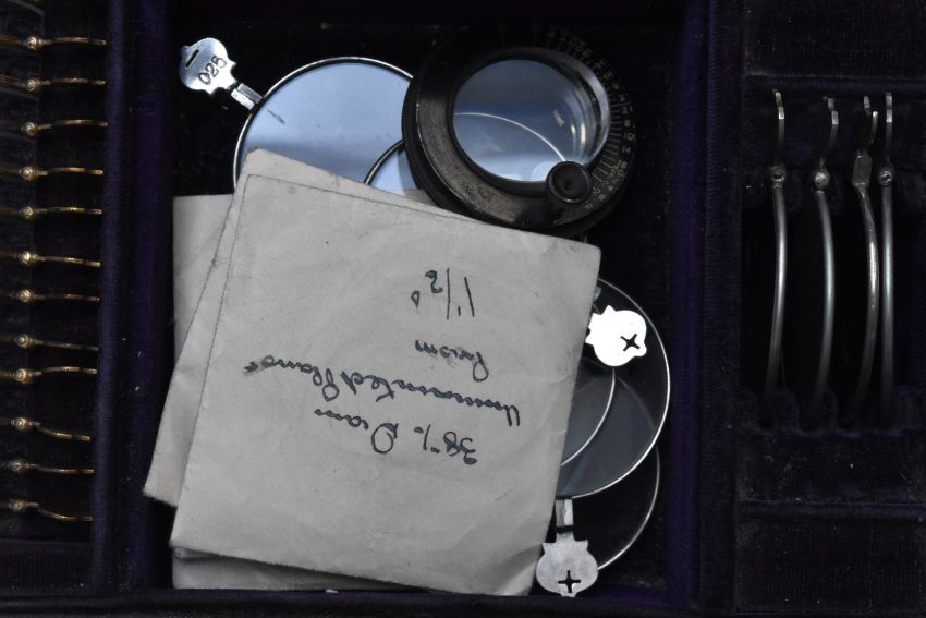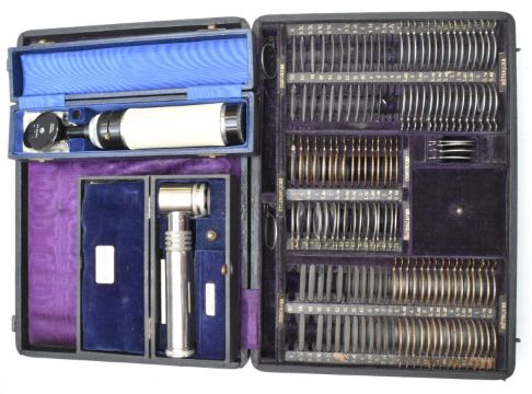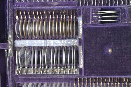 19th or early 20thC cased set of opticians lenses, with tooled leather titles and leather cover to case, width 36cm, together with two similar interest instruments, both cased