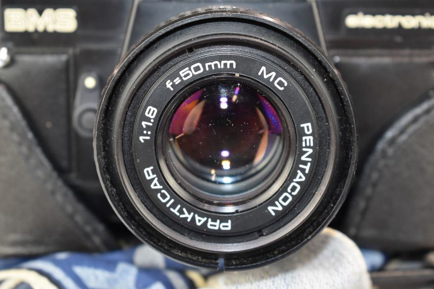 Practika 35mm SLR BMS electronic camera together with a Fujifilm S8000fd digital camera, Chinon Cenesis III camera, and a Praktica BC 1600 flash unit