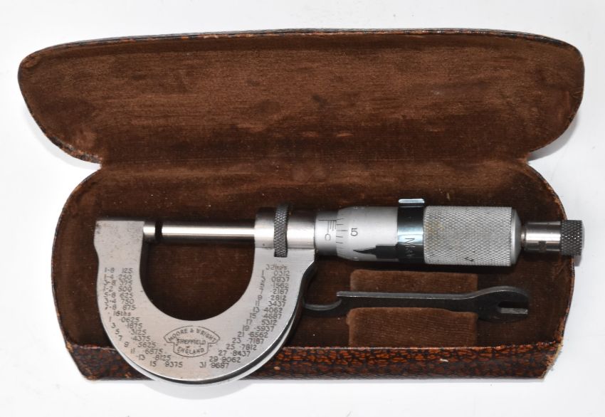 Four various micrometers comprising Moore & Wright 8-9 inch and 0-1 inch examples, Starrett bore micrometer and a Shardlow 1-2 inch examples, all boxed