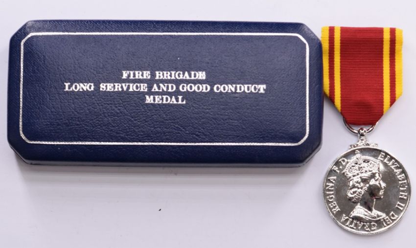 Fire Brigade Long Service & Good Conduct Medal named to Leading Fireman Michael J Powell together with a pair of WW2 Kershaw No2 MkIII binoculars 235519 dated 1944