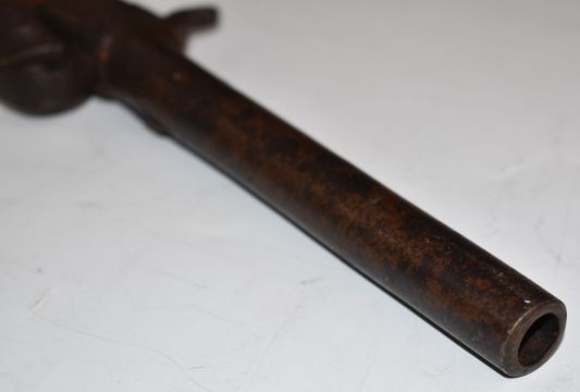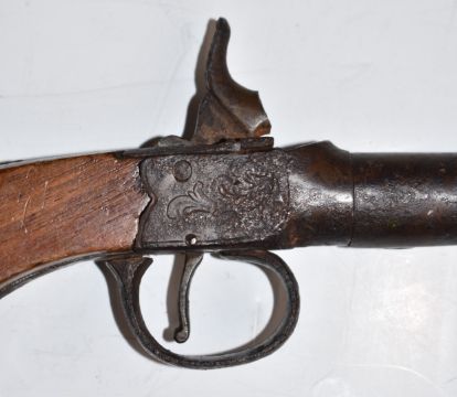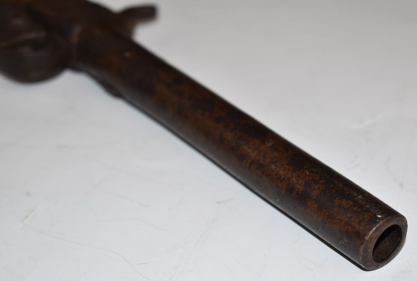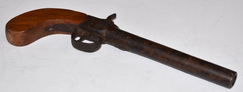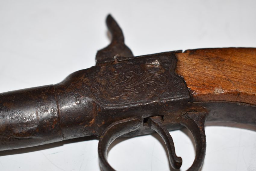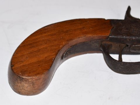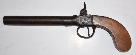 Unnamed 50 bore percussion hammer action pocket pistol with engraved lock and trigger guard and 5.25 inch barrel, overall length 25.5cm.