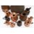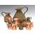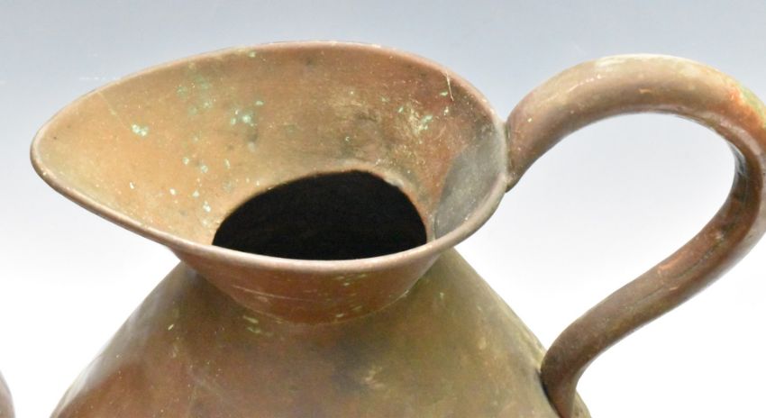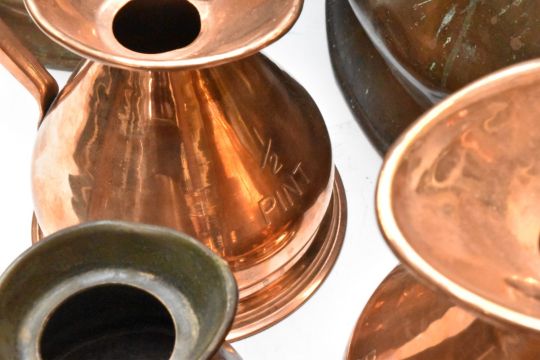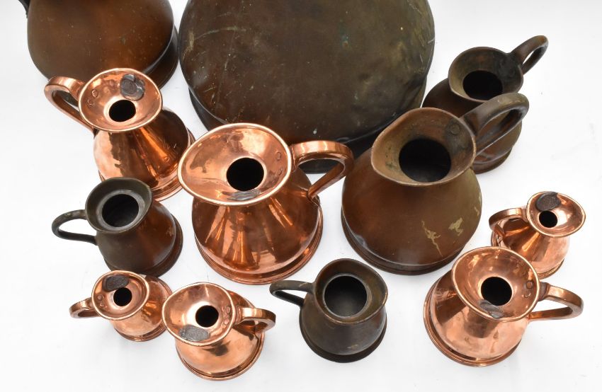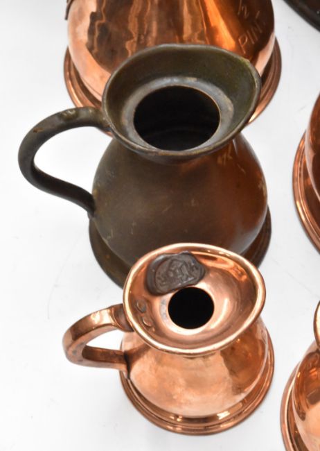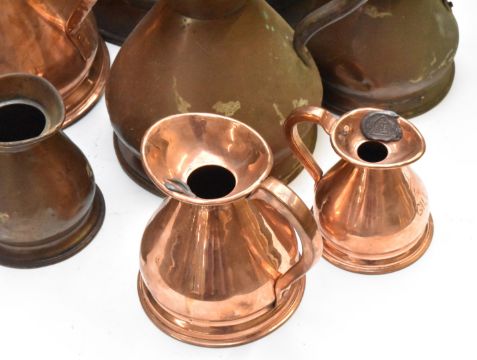 Graduated set of six copper measuring jugs from 2 gallon to half pint, together with six further similar jugs